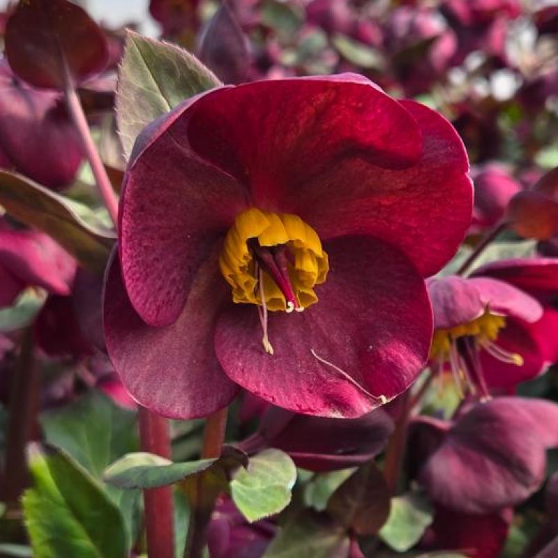 ‘Vibey Velvet’ is a dramatic hellebore featuring rich, velvety burgundy-red blooms with glowing golden centers that emerge in late winter and early spring. Its deep coloring and strong, upright stems make it a standout in shaded borders, while the evergreen foliage provides structure and interest throughout the year.