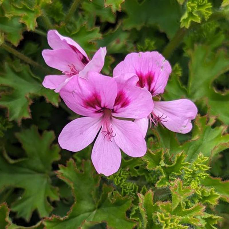 A vigorous scented geranium with finely textured green leaves that release a strong lemon fragrance when touched. Soft pink blooms with magenta centers appear through summer. Popular for use in containers, herb gardens, and crafts where its citrusy aroma shines.