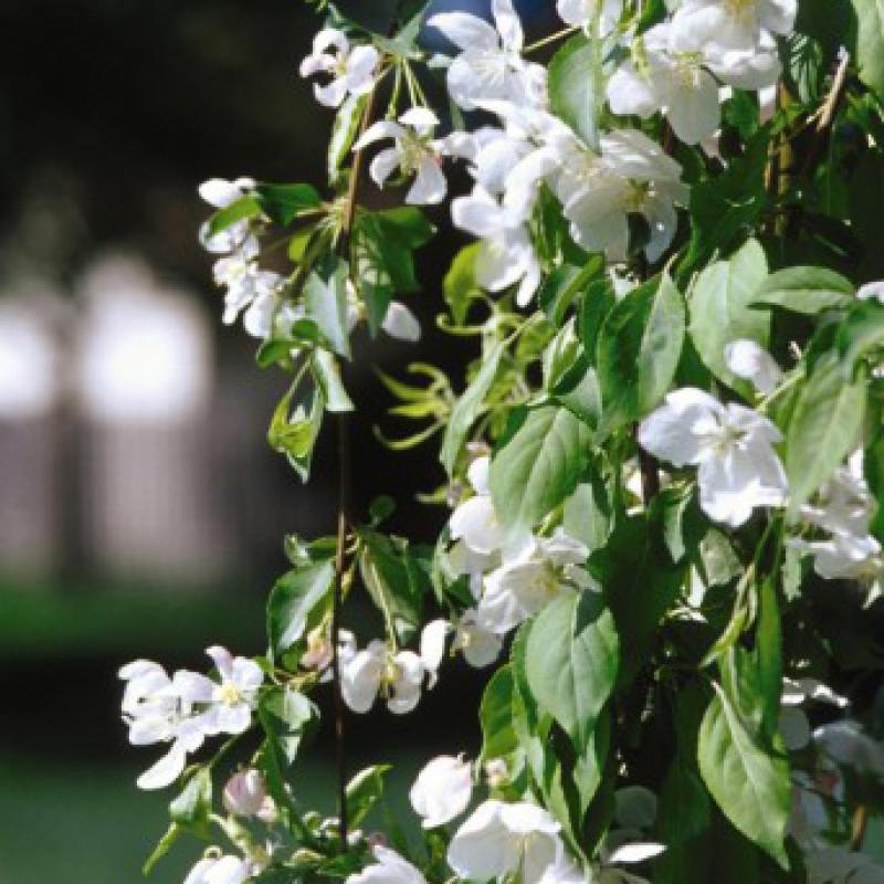 Lovely masses of large, pink buds open to apple blossom pink then fragrant, white blossoms. The glossy, vibrant green foliage creates an upright, weeping habit that makes for an interesting and graceful specimen plant. The birds love the glossy red fruit!