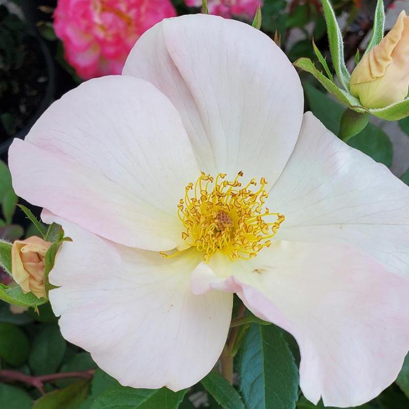 Large, almost single, creamy white flowers, that are slightly fragrant, are held in large bunches- all with golden yellow centers. A free-flowering rose that is nearly always in bloom. The climbing nature of this rose allows it to be ideal for a wall or fence. Deliciously beautiful blooms attract bees! Nearly thornless!