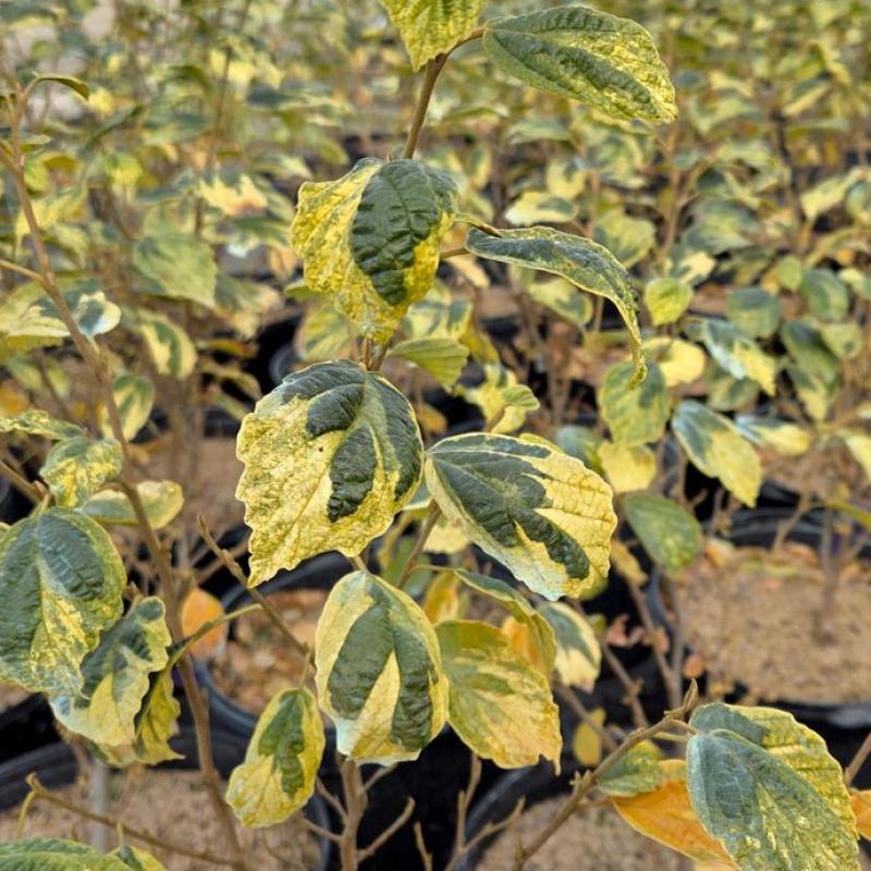 A compact, refined selection of native witch hazel with handsome green leaves edged in golden variegation. Fragrant yellow ribbon-like flowers appear in late fall, often after leaf drop, providing rare seasonal interest when little else is blooming.