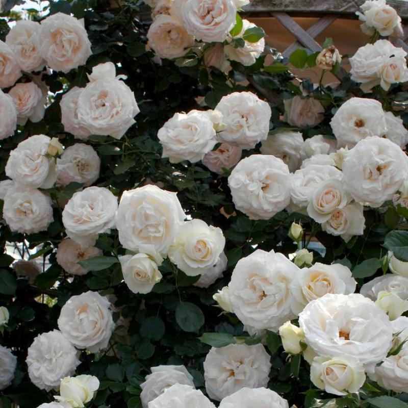 A romantic climbing rose with large, fully double blooms in creamy white with subtle blush undertones. Slow to open, the flowers resemble peonies and bloom repeatedly through the season. Ideal for arbors, trellises, or fences.