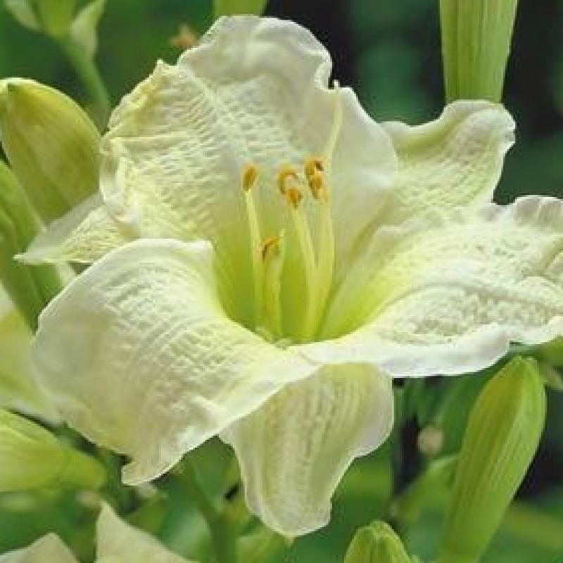 'Gentle Shepherd' produces 5" near white blooms with yellow-green throats in early to mid-July over a collection of semi-evergreen leaves.