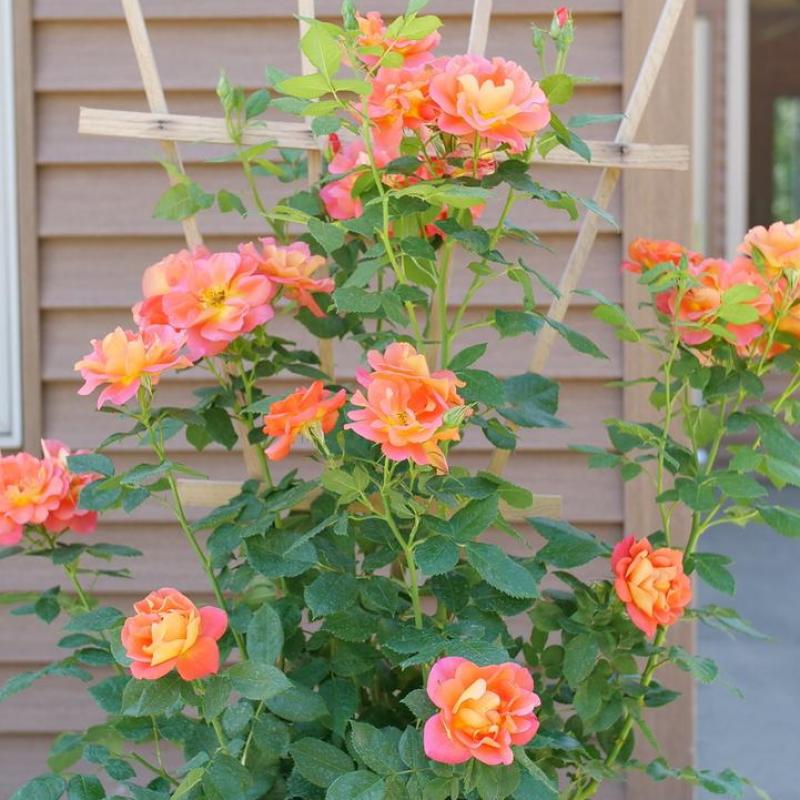 Warm up your view with Rise Up Emberays rose. Its glowing orange and yellow blooms arrive continuously throughout the summertime. As they mature they soften to a pale pink and fold up like a traditional garden rose, giving them more range than your favorite actor! Makes a lovely low hedge, addition to your cut flower garden, or as a feature against your porch, climbing up a trellis. It can fill so many roles thanks to a versatile habit, it grows nicely on its own, but looks lovely trained upward with support as well. Excellent garden performance and good disease resistance allows you sit down, relax, and enjoy the view.