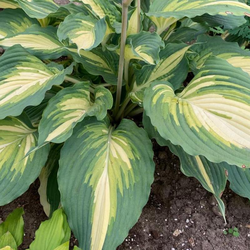Long heart-shaped leaves have medium green margins with chartreuse jetting that bleeds into creamy white centers. The medio-variegation extends from leaf tip to the petiole, flaring at the base of the leaf. A gentle piecrust wave edges each leaf. Tall scapes hold large clusters of tubular white flowers in early summer, creating a Hosta that can be enjoyed for its foliage and flowers.