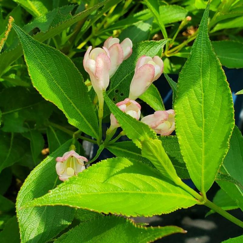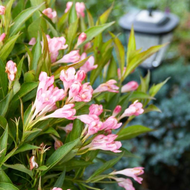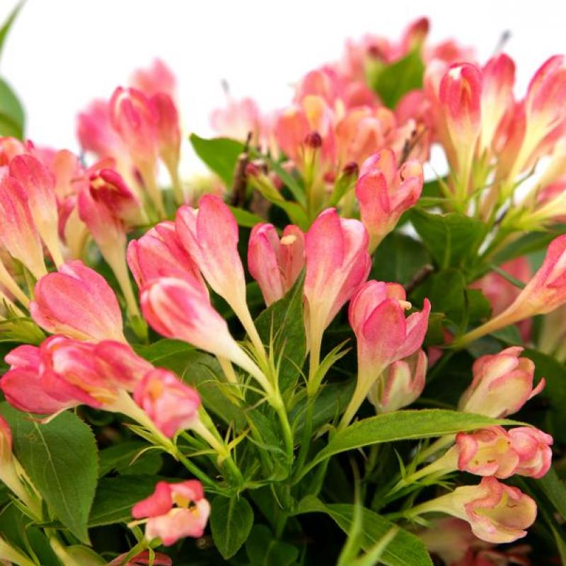 Warm and fuzzy feelings explode from this adorable new and improved reblooming Weigela that’s loaded with peachy pink flowers.