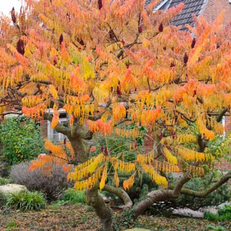 This stunning native cultivar features finely cut, fern-like foliage that turns brilliant shades of orange, red, and gold in fall. Its sculptural branching and velvety stems add winter interest, while clusters of red fruit attract birds and persist into the cold months.