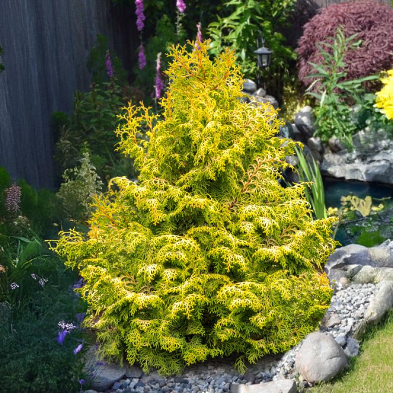 ‘Melody’ is a compact, pyramidal evergreen with finely textured, thread-like golden foliage that provides a soft, elegant appearance. Its vibrant color holds year-round, brightening the garden even in winter. Perfect for small landscapes, borders, or as a cheerful accent plant.
