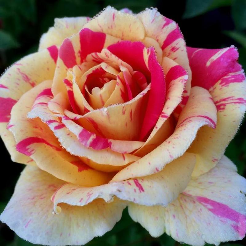 A showstopping rose with creamy yellow petals dramatically streaked and splashed with bold pink. This floribunda offers a delightful fragrance and excellent rebloom throughout the season.