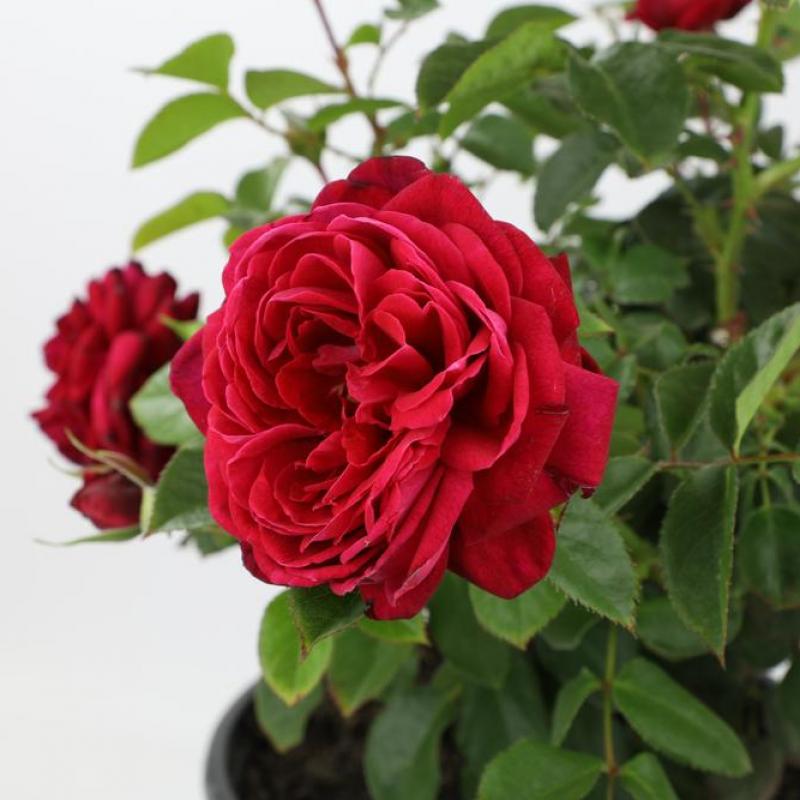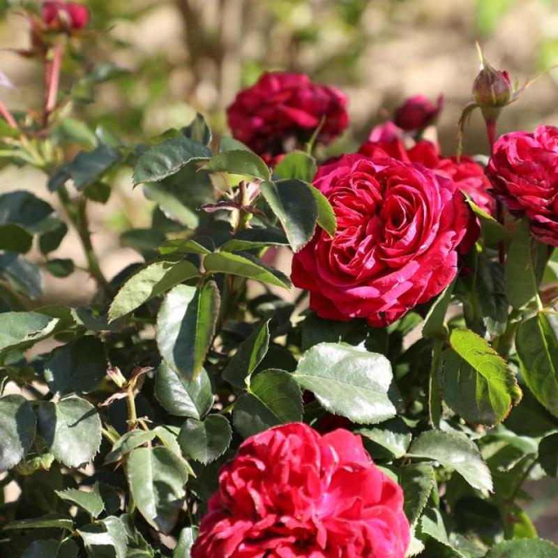 Rosa 'True Endearment' is a captivating rose with dark glossy green foliage and deep red flowers. Each bloom boasts over 60 petals in a quartered style and offers a spicy fragrance, adding a touch of warmth and sophistication to any garden.