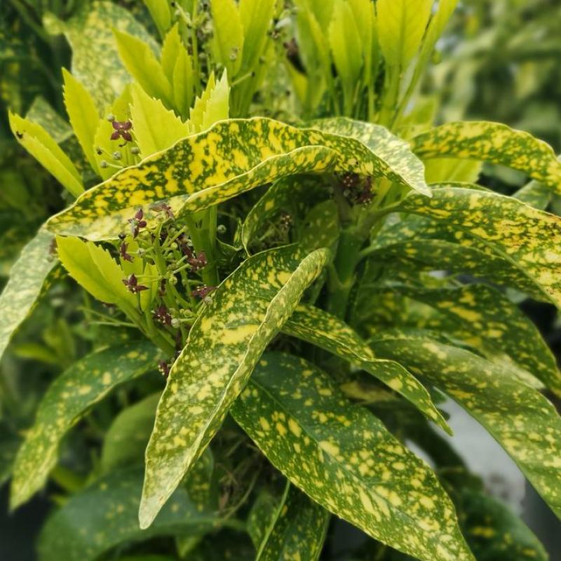 The dense, glossy foliage of this evergreen plant is splattered with yellow. Use in beds and borders. This plant is poisonous. Deer tolerant and showy foliage.