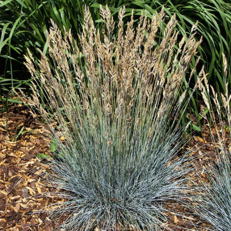 Bright, tan seed heads rise burst out from the fine-textured, green, blade-like foliage on erect, red stems. This Festuca has a significantly distinct look compared to other varieties. Adaptable in many conditions- including dry shade.