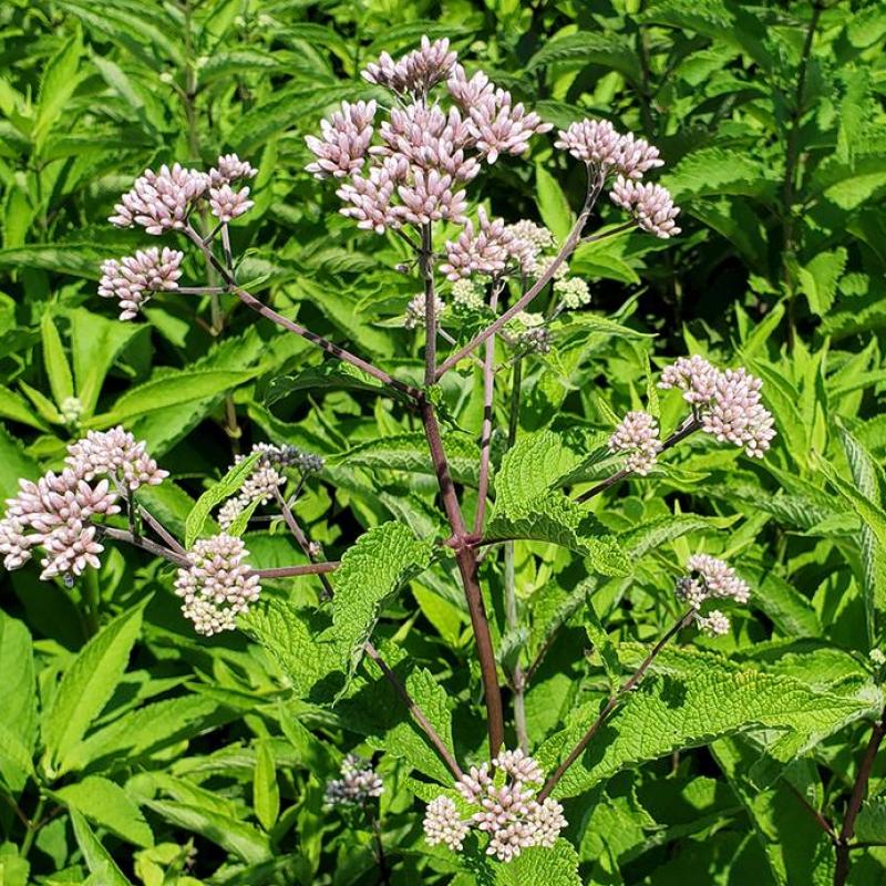 A towering native perennial with vanilla-scented foliage and soft pink flower clusters that bloom in late summer. Sweet Joe Pye Weed is beloved by butterflies and makes a bold statement in moist meadows, rain gardens, or naturalized plantings.