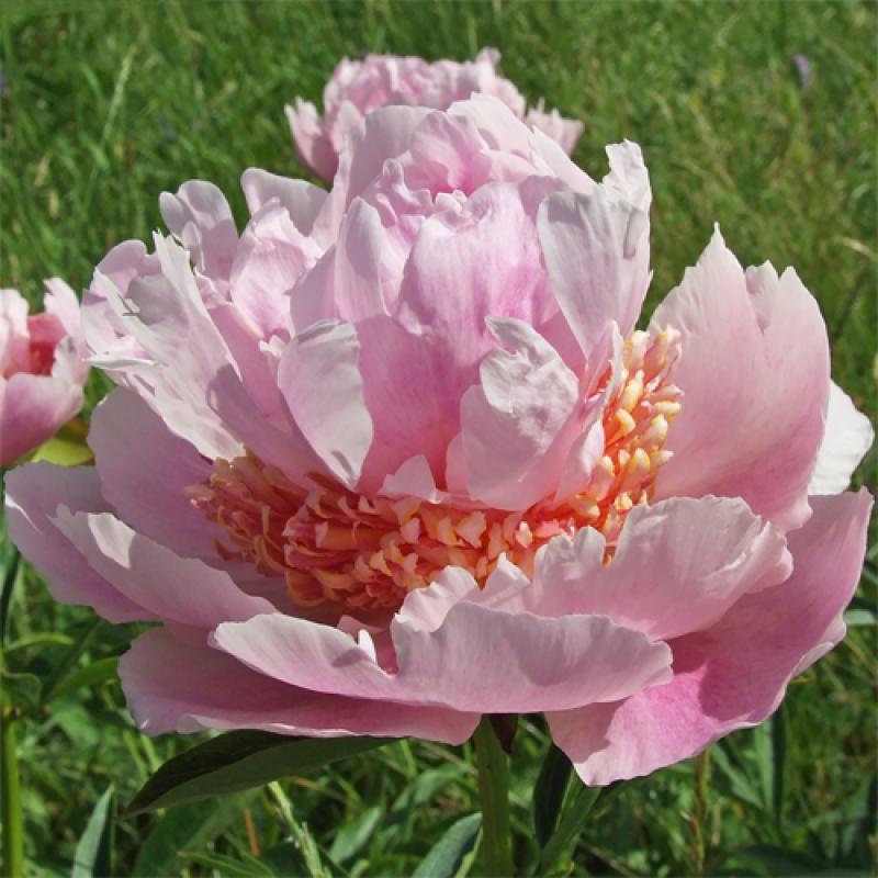 A charming and compact peony with soft pink blooms accented by a fluffy yellow center ring. Beautifully fragrant and perfect for borders and smaller gardens.