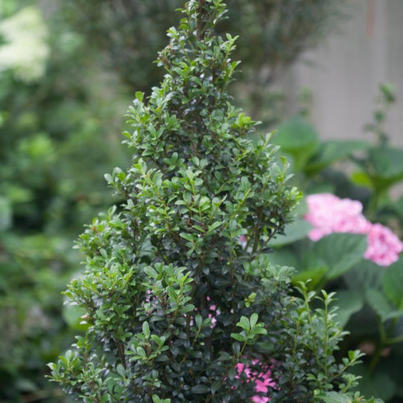 A narrow, upright evergreen with dense, glossy foliage that forms a striking columnar shape. Perfect for small gardens, entryways, or as an accent in formal plantings, ‘Sky Box’ maintains its shape beautifully with minimal pruning and offers year-round structure and color.