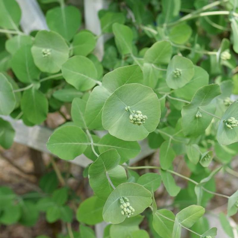 This wild-looking plant is actually native to North America. Each season, it begins like any other honeysuckle, with typical dusty green leaves. As the season progresses, flower buds pop out like saucers. These rounded bracts look a lot like eucalyptus, but the flowers at the center feed native pollinators like hummingbirds! They turn into red berries in the fall, but won’t become a nuisance like other honeysuckles. Due to its size and interesting seasonal changes, it makes an incredible specimen.