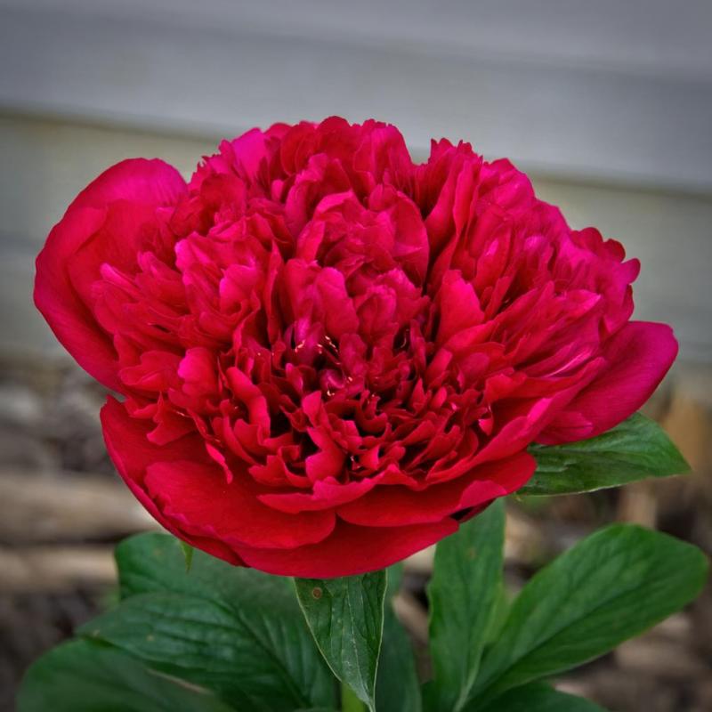 A vibrant, fully double peony featuring rich cherry-red blooms packed with ruffled petals. This vigorous, reliable variety blooms in late spring, offering bold color, strong stems, and lush green foliage that remains attractive through summer.