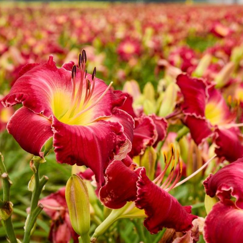 Massive 6" raspberry red flowers are complemented by a wide rosy pink eye that leads to a yellow throat. A thin white margin edges each petal. Flowers are held on proportionate scapes, just above the foliage. There are no hardiness concerns with this red daylily as it was bred and selected in Minnesota. Daylilies can survive many harsh conditions that other plants cannot including polluted city environments, slopes and poor and dry soils.