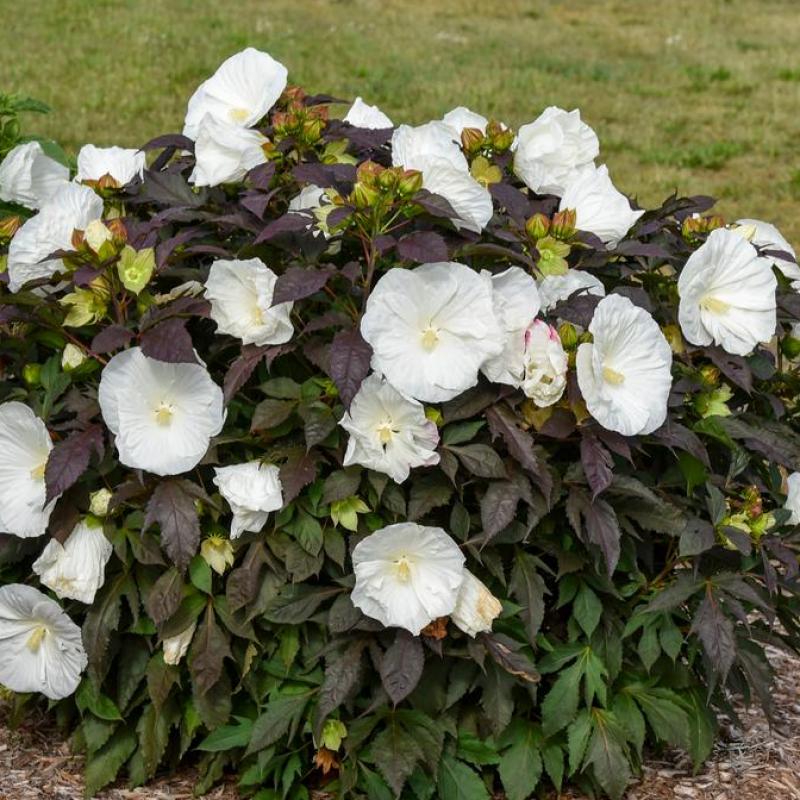 Striking perennial with huge, pure white flowers that pop against deep burgundy foliage. Long summer bloom season and bold presence make it perfect for sunny borders or water-side plantings.
