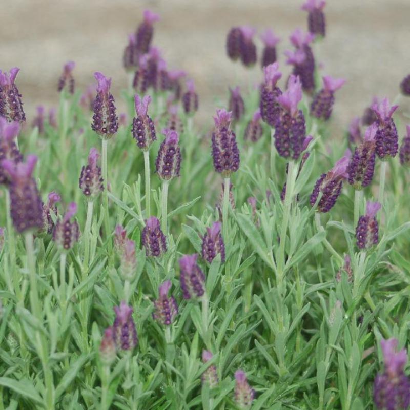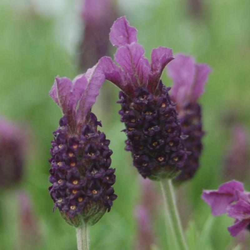 A compact lavender with deep purple flower “pinecones” topped with showy violet bracts. Blooms early and often, and is an excellent choice for containers, sunny borders, and patio plantings.