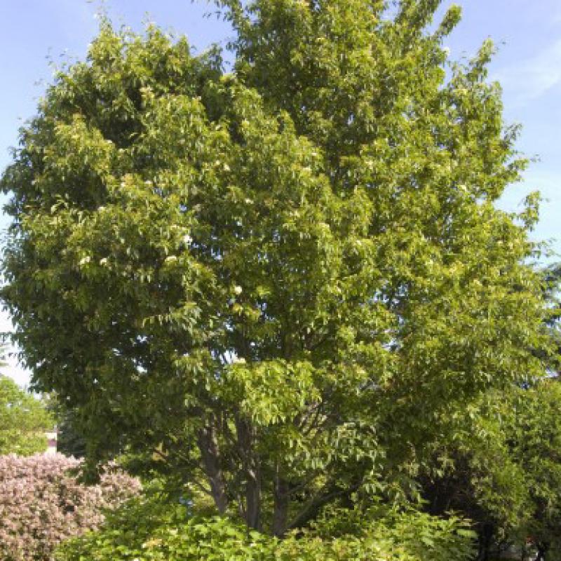 This hardy tree has small white flowers in May that produce abundant clusters of scarlet berries in the fall. Smooth, dark brown bark with lustrous deep green leaves that are wavy and serrate. Golden-orange fall color.