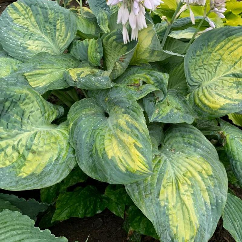 A dramatic hosta with large blue-green leaves featuring golden-yellow centers that lighten through the season. Forms a bold clump and sends up lavender flower spikes in midsummer. Excellent for shady borders and mass plantings.