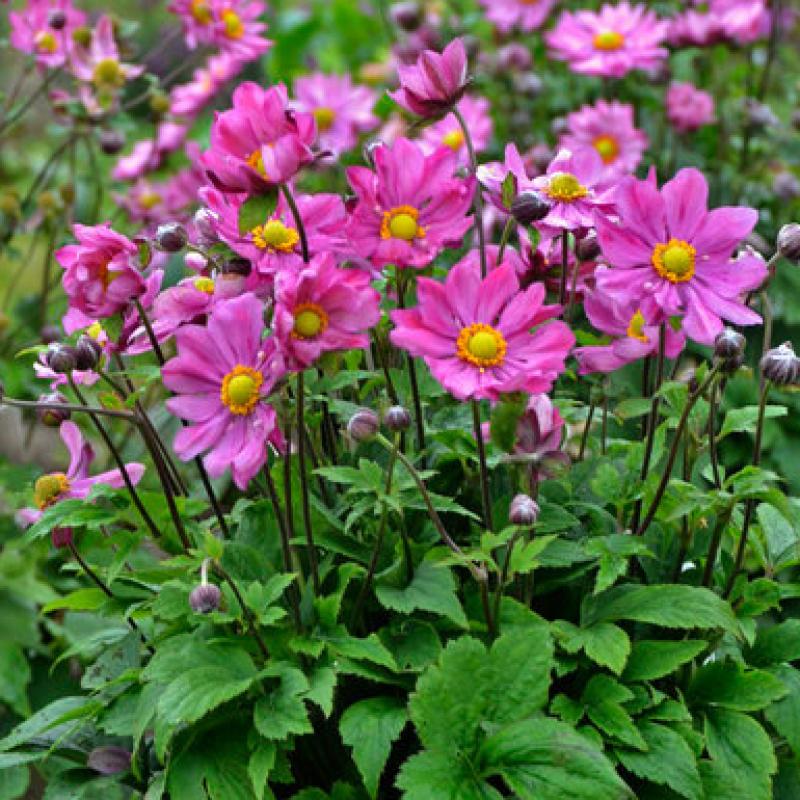 Upward facing, single, deep rose-pink flowers with yellow centers hover on this variety's burgundy tinted stems from late August into September. A compact plant, it also offers deep green, filigreed foliage.