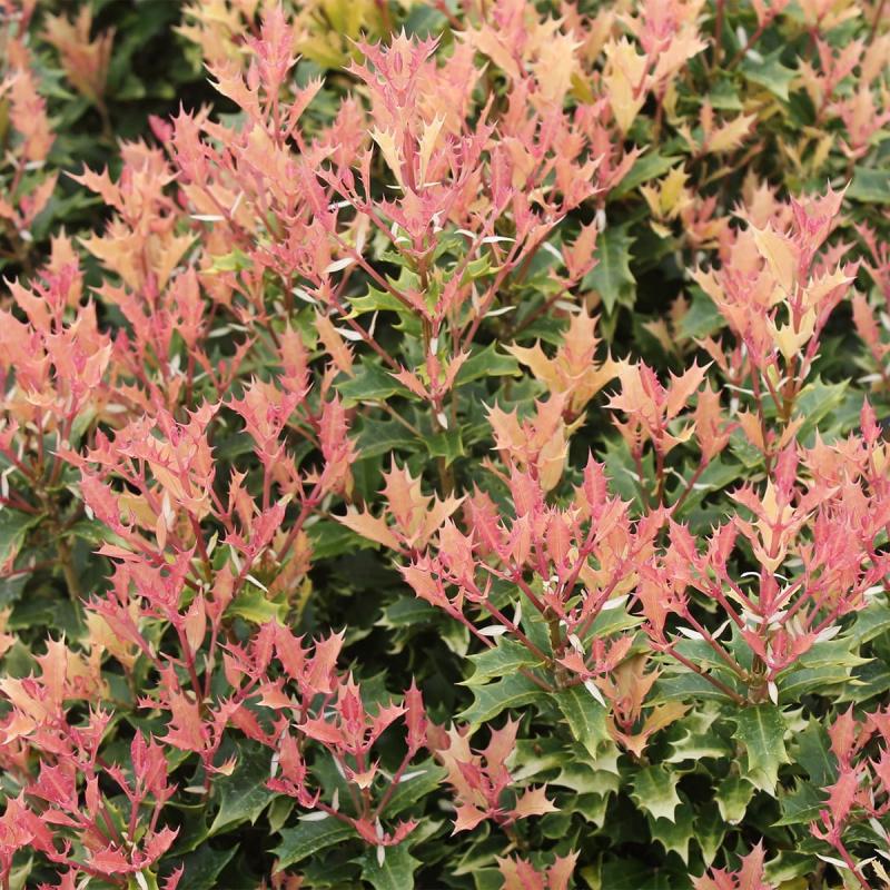 A colorful evergreen shrub with striking new growth that emerges pink and cream before maturing to glossy green. The holly-like foliage adds texture and year-round interest, while its compact form makes it ideal for borders, foundations, or low hedges. Fragrant white flowers appear in fall, adding a surprise burst of scent.