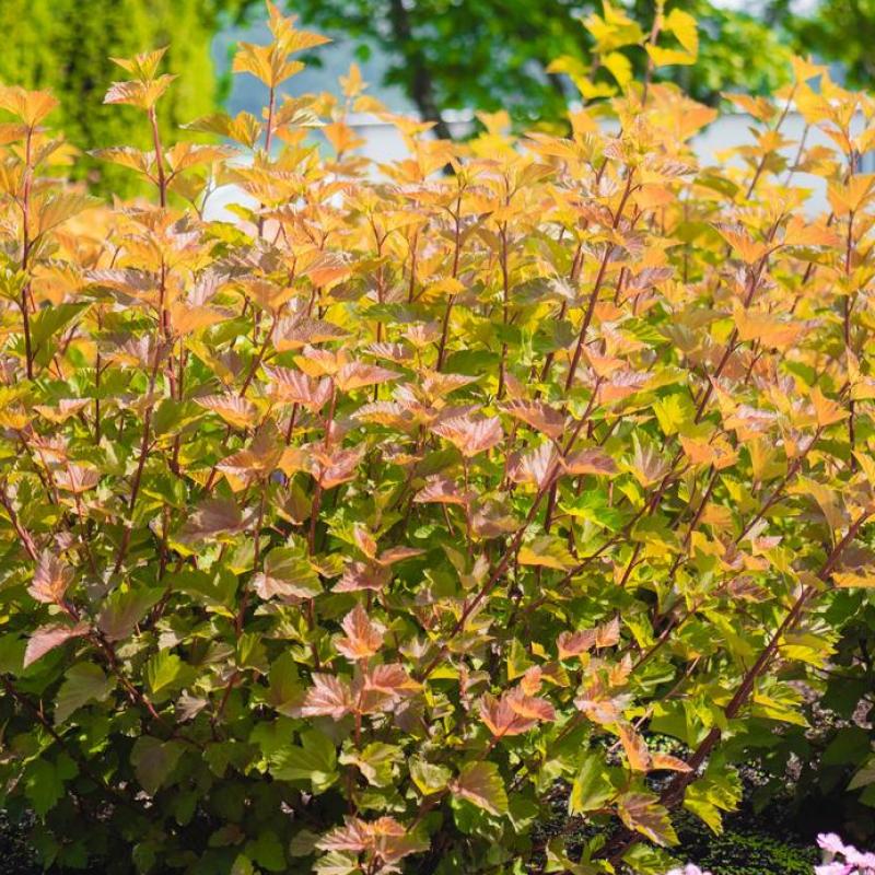 This compact, easy-care shrub boasts stunning copper-orange to golden-yellow foliage that adds vibrant color from spring through fall. Clusters of small white flowers bloom in late spring, attracting pollinators. Great for borders, hedges, or mixed beds.