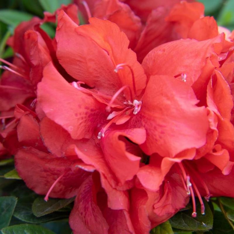 A compact evergreen azalea with vivid ruby-red, semi-double blooms that appear in spring and again later in the season. Its rich green foliage and striking color make it perfect for borders, foundations, or containers.