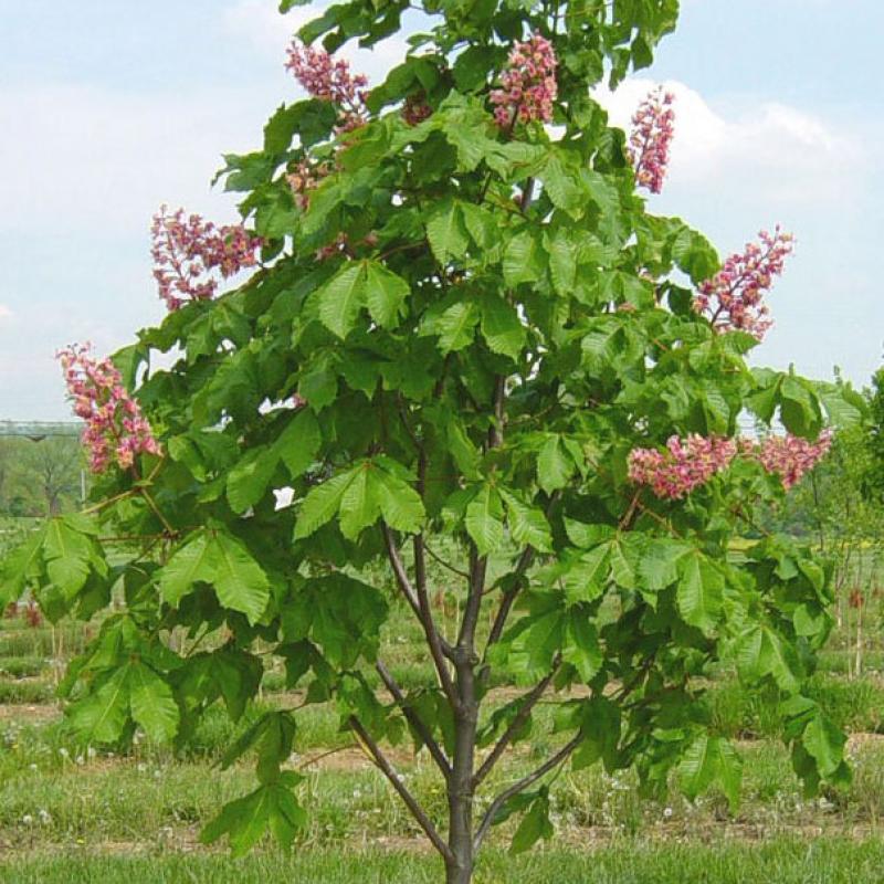 'Briotii' is a smaller growing, pink version of our old fashioned horse chestnut with palmately divided mid-green leaves and spires of deep pink flowers in late April-May.