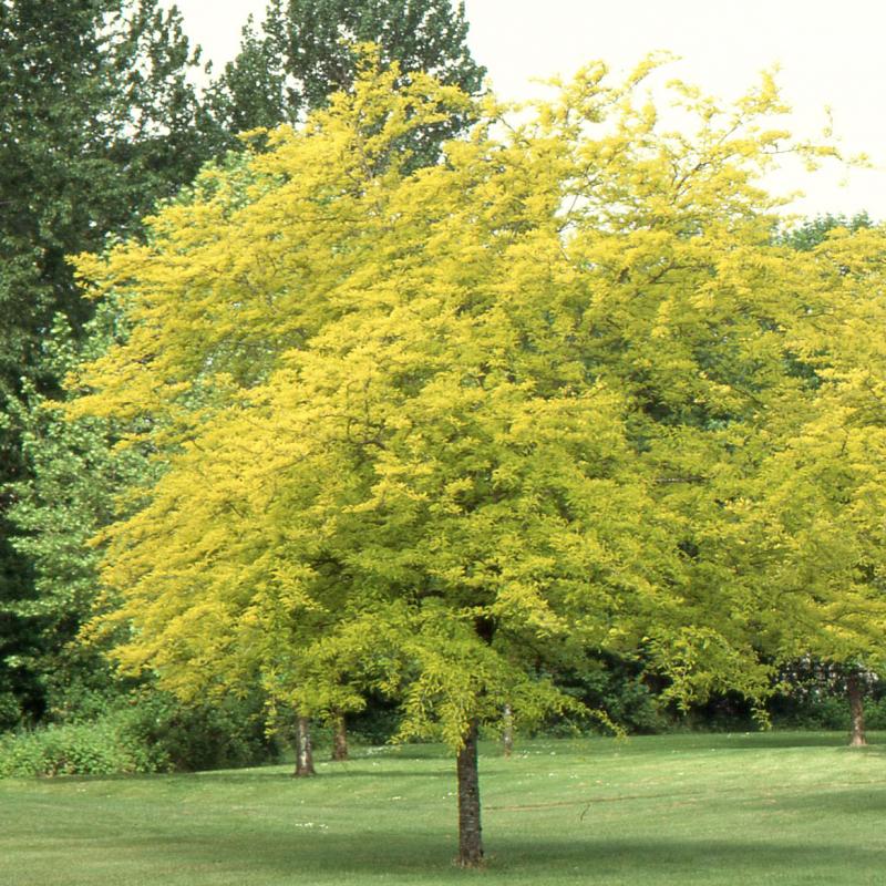 A popular thornless honeylocust with brilliant golden-yellow new growth that matures to light green. Fine-textured foliage creates light, filtered shade, making it an excellent lawn, street, or patio tree.