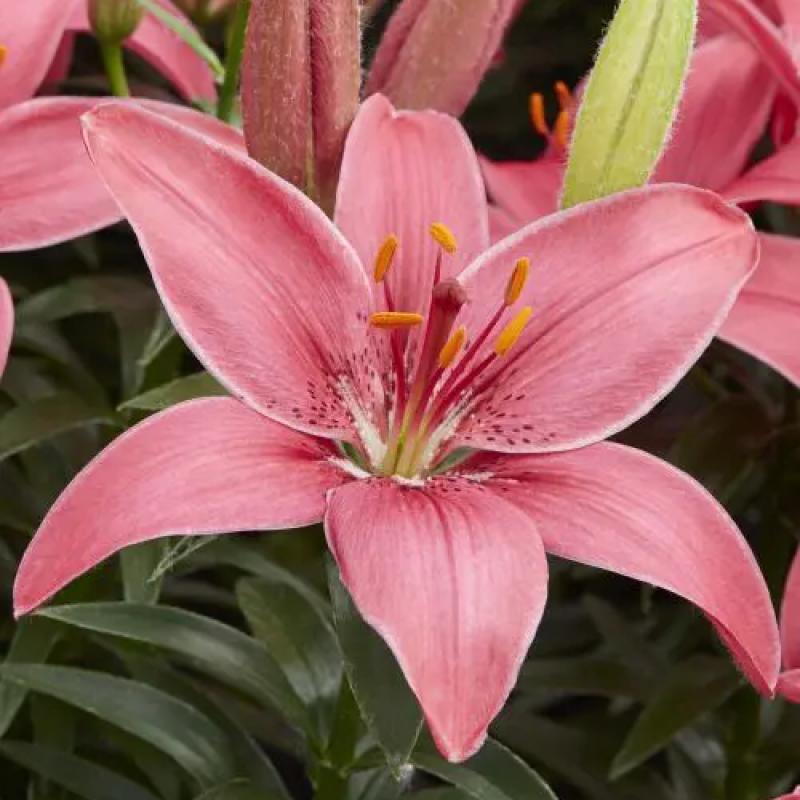 ‘Pippa Joy’ is a charming, compact Asiatic lily with soft rose-pink blooms accented by subtle darker freckles near the center. Its upward-facing flowers appear in early to midsummer on strong, sturdy stems, making it an excellent choice for containers, borders, and cutting gardens where dependable color and tidy form are desired.