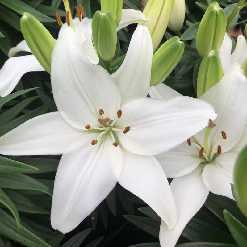‘Sparkling Joy’ is a compact Asiatic lily with crisp, pure white, upward-facing blooms and clean, elegant form. Flowering in early to midsummer, its sturdy stems and tidy habit make it ideal for borders, containers, and cut flower gardens. The bright white flowers pair easily with any color palette and bring a fresh, polished look to the landscape.