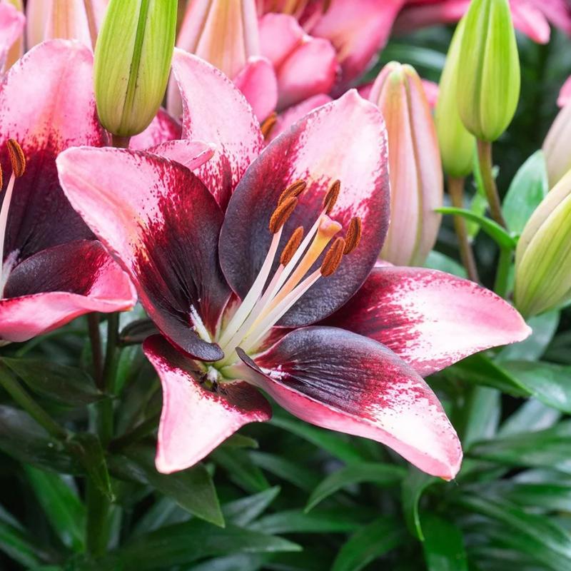 Large, upward-facing blooms feature striking pink petals dramatically brushed with deep burgundy at the center. Compact and sturdy, this Asiatic lily delivers bold midsummer color, excellent garden performance, and makes a standout cut flower.