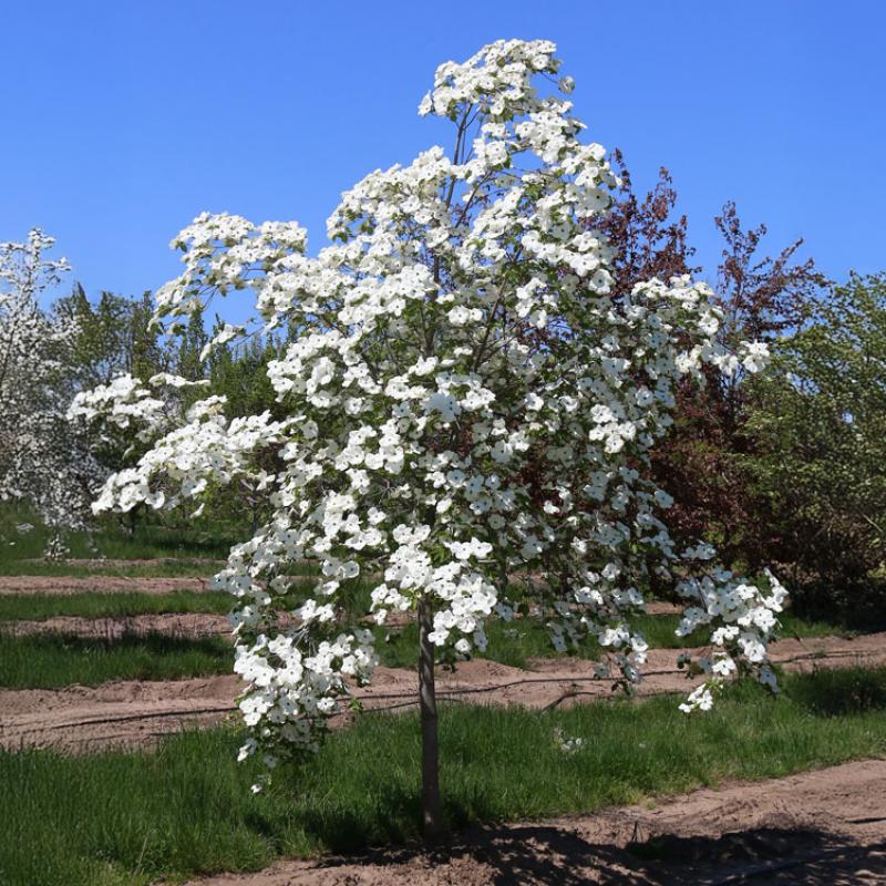 A hybrid between the Pacific dogwood and flowering dogwood, this small ornamental tree is renowned for its heavy spring bloom. Large, overlapping white bracts create a dazzling display, followed by rich red fall foliage and bright red berries that attract birds. Its elegant, upright form and multi-season interest make it a standout specimen.