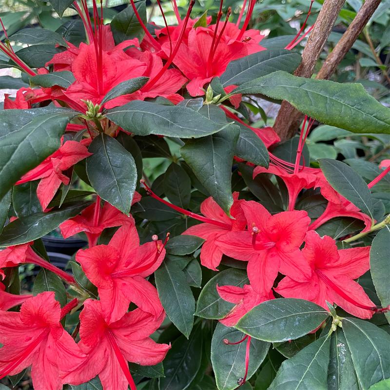 A striking native azalea that lights up the late summer garden with fiery red-orange blooms, 'Plumleaf Azalea' is one of the last azaleas to flower each year. Its glossy foliage and upright form make it an exceptional accent for woodland borders and naturalized landscapes.