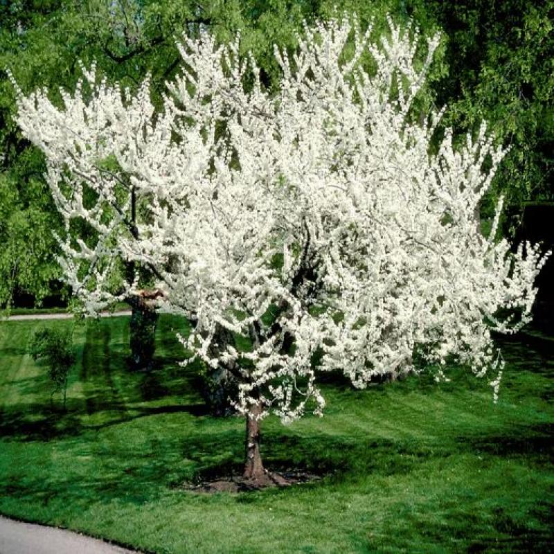 A stunning small ornamental tree prized for its profusion of pure white spring blooms that cover bare branches before the foliage emerges. Heart-shaped green leaves follow, creating a fresh summer canopy. Provides year-round interest and works beautifully as a specimen or focal point.