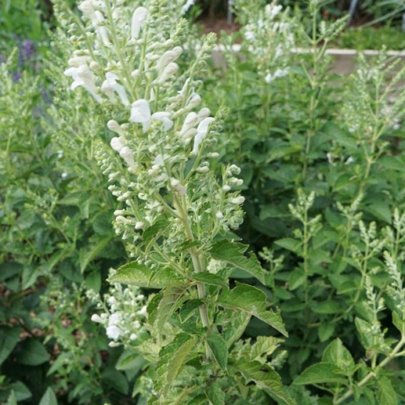 An upright perennial with showy spikes of pure white, hooded flowers atop sturdy stems with gray-green foliage. Blooms midsummer to fall and thrives in sunny gardens, adding pollinator-friendly vertical interest.
