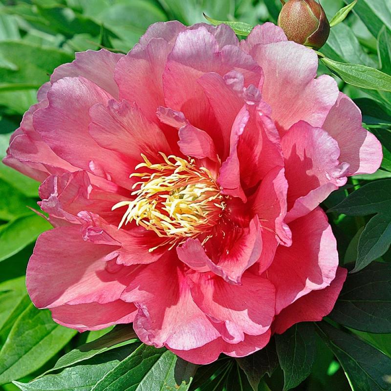 Huge, semi-double to double blooms open coral-pink and gradually soften to peach and creamy yellow tones as they mature. Strong, upright stems hold the massive flowers above lush foliage, making this Itoh peony a standout focal point in late spring to early summer gardens.