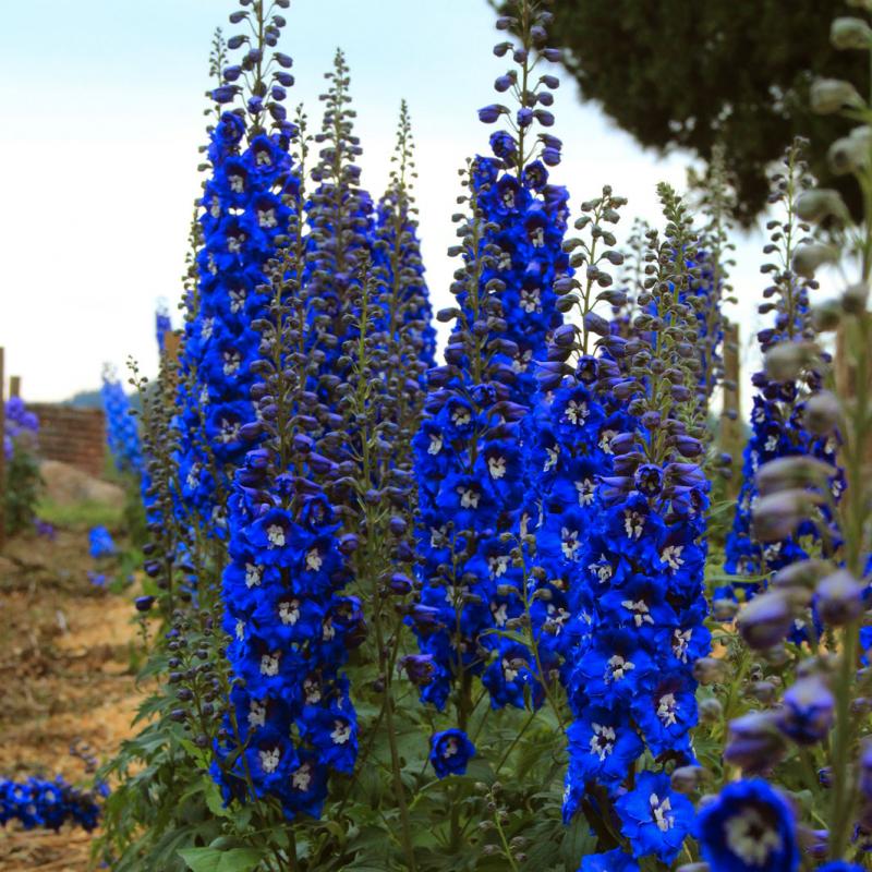 Produces stunning spires of cobalt-blue flowers with charming white interiors that appear in late June and July with repeat bloom with deadheading an good fertilization.