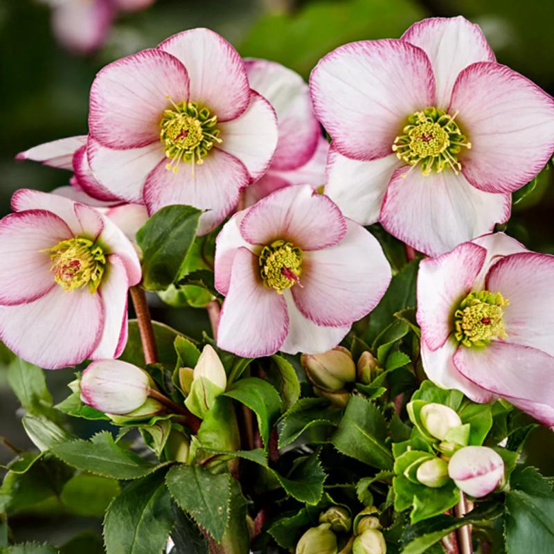An early-blooming perennial with elegant white flowers edged in deep pink to red, adding long-lasting color from late winter into spring. Glossy evergreen foliage provides year-round interest, making it a standout in shady gardens.