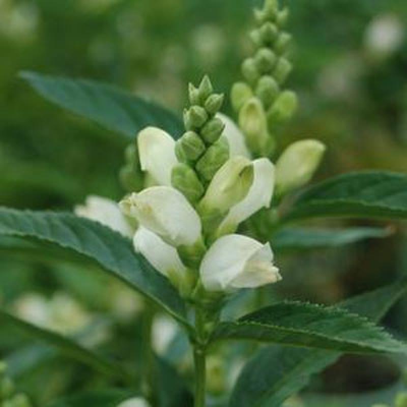 This variety features lush upright stems and foliage that is topped by spikes of two-lipped, creamy white flowers occasionally tinged pink in late July and August.