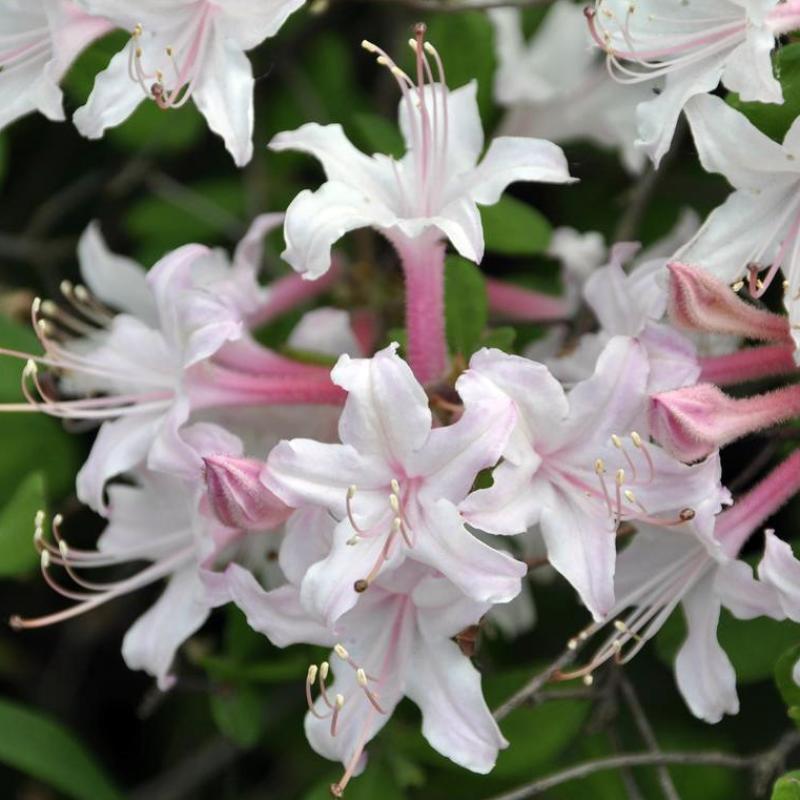 A charming deciduous azalea native to the Mid-Atlantic coastal plain, featuring clusters of fragrant white to pale pink flowers with rosy tubes in late spring. Compact and spreading, it’s ideal for naturalistic gardens and native plant landscapes.