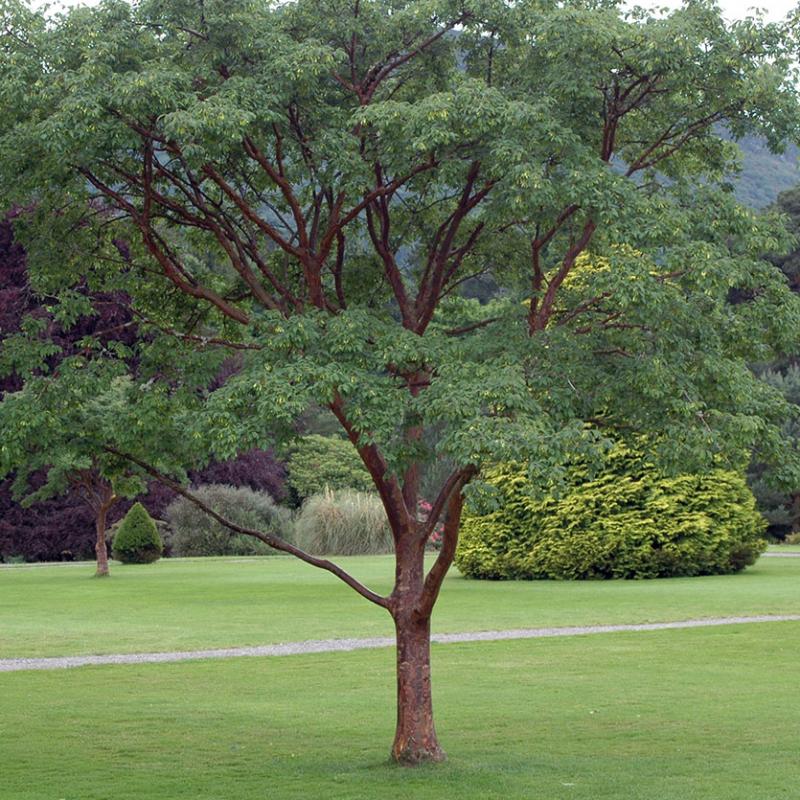 This small tree has rich reddish-brown exfoliating bark that is beautiful all year long, especially in winter when accentuated by snow. The deep green, tri-foliate leaves turn fiery red-orange to yellow in fall.