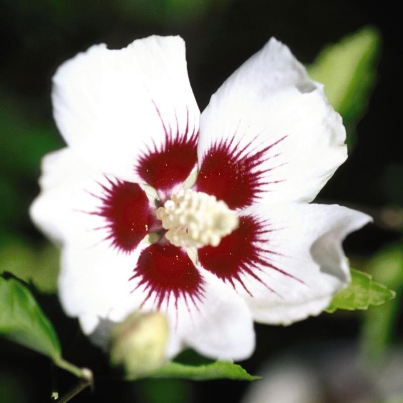 Single, white flowers with a deep red eye can be found on this selection that blooms from July to September. A robust, upright to rounded plant with rich green foliage, it will benefit from hard pruning in spring.