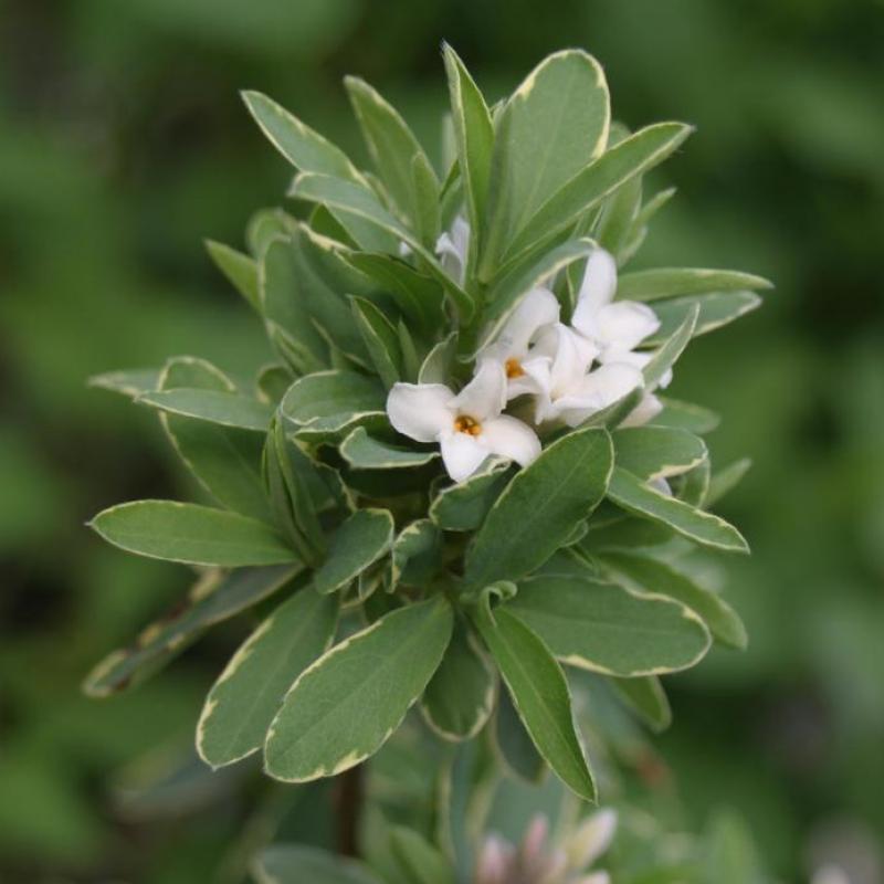 A compact, semi-evergreen shrub with creamy-white variegated foliage and intensely fragrant, pale pink to white blooms from spring through fall. A refined choice for borders, entryways, or containers.