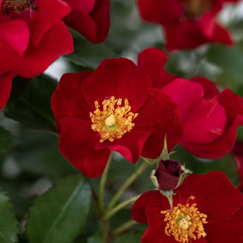 A compact, low-growing shrub rose with vibrant scarlet-red blooms accented by bright yellow centers. Blooms continuously from spring through frost, offering long-lasting color in the garden. Highly disease resistant and easy to grow.