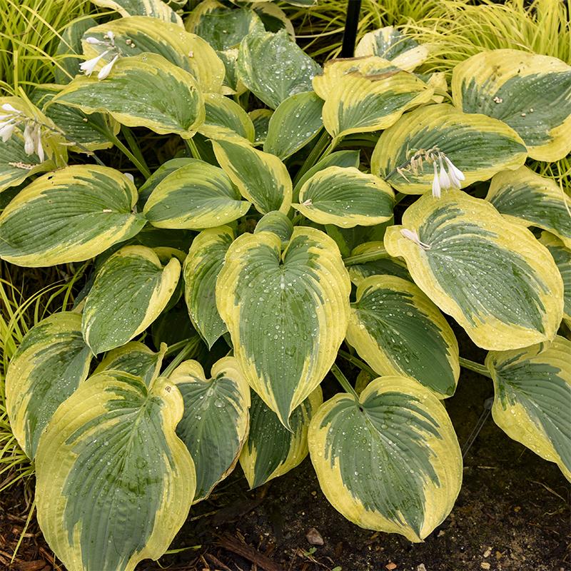 A bold, shade-loving hosta with thick, blue-green leaves edged in bright gold. Its strong color contrast and heavy substance make it a standout in woodland gardens, borders, and shade containers.
