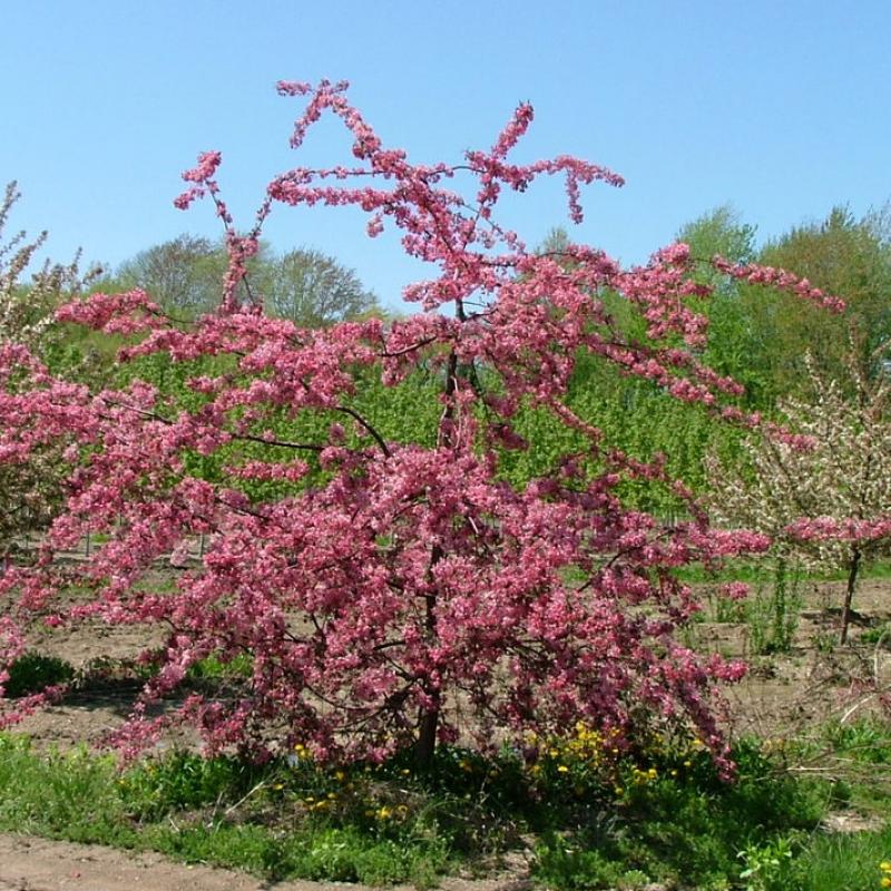 A graceful weeping crabapple that produces an abundance of deep pink flowers in spring, creating a cascading display of color. The arching branches are covered in blossoms, followed by small ornamental fruit that persist into fall and attract birds. Its elegant form makes it an ideal specimen tree for focal points in the landscape.